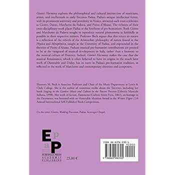 Giotto's Harmony explores the philosophical and cultural intersection of musicians, artists, and intellectuals in early Trecento Padua. Padua's unique intellectual fervor, with its prominent university and proximity to Venice, attracted such titan celebrities as Giotto, Dante, Marchetto da Padova, and Pietro d'Abano. The richness of their cross-disciplinary work places Padua at the forefront of pre-humanism. Both Giotto and Marchetto da Padova sought to reproduce natural phenomena as faithfully as possible in their respective métiers. Professor Beck argues that this return to nature is a reflection of the rebirth of the Aristotelian philosophy of nature found in the Physica and Metaphysica, taught at the University of Padua, and expounded in the theories of Pietro d'Abano. Paduan musical pre-humanist contributions are posited to be at the vanguard of musical development in Italy, rather than a footnote to the musical culture of Florence. Indeed, Giotto's Harmony makes the case that the musical Renaissance, which is often believed to have its origins in the much later work of Dunstable and Dufay, has its roots in Padua's pre-humanist tradition, as reflected in the work of Marchetto and contemporary theorists and composers.